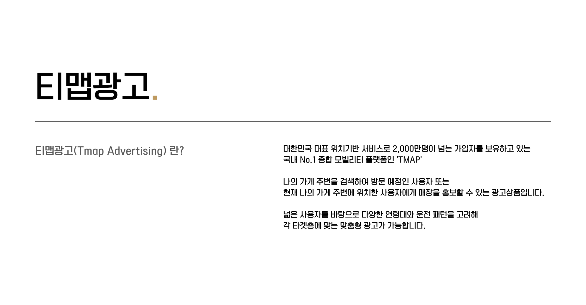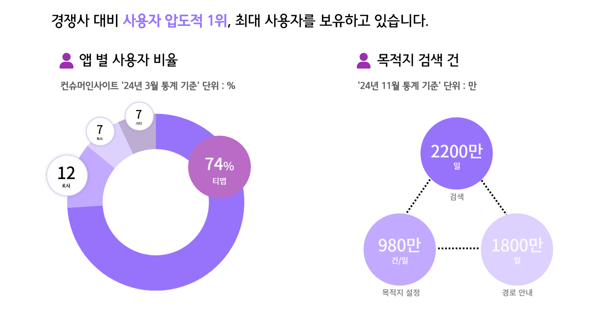 대한민국 대표 위치기반 서비스로 2,000만명이 넘는 가입자를 보유하고 있는 국내 No.1 종합 모빌리티 플랫폼인 'TMAP'